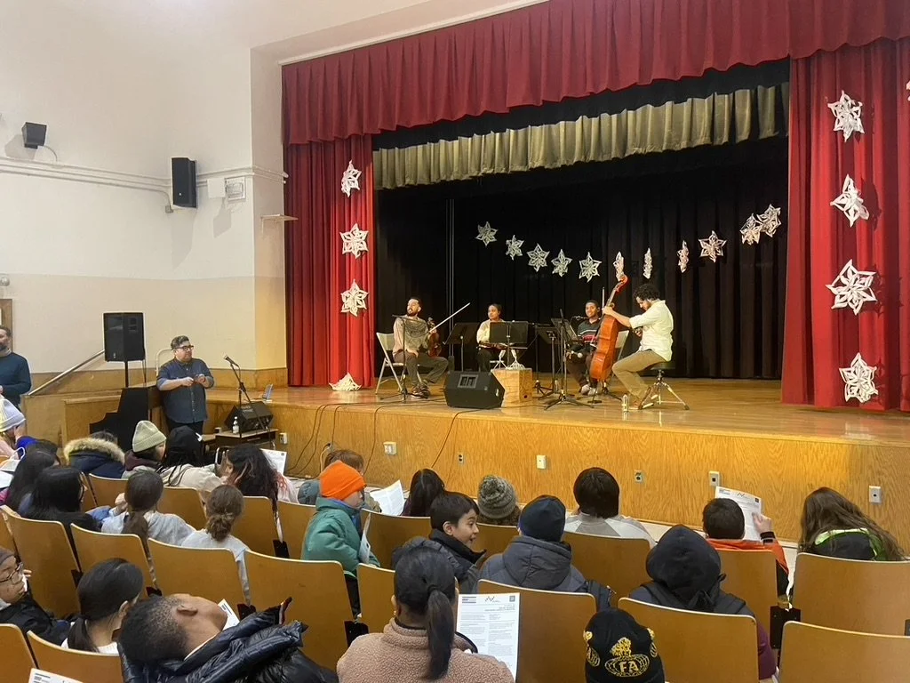 Students attend jazz concerts in the school auditorium featuring musicians from Lincoln Center.